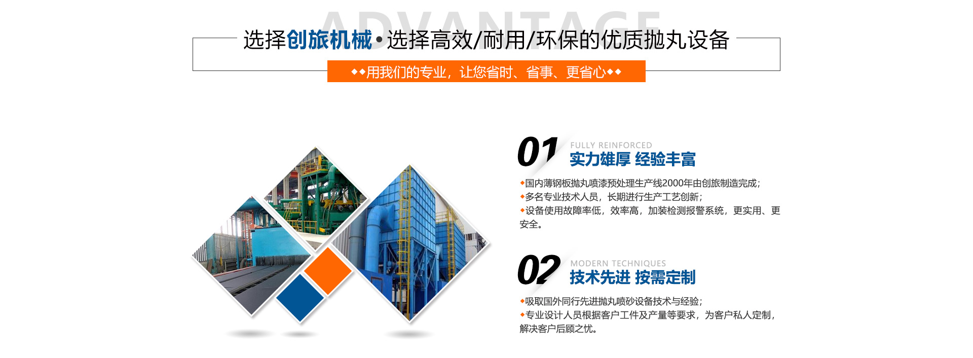 合肥市創(chuàng)旅機(jī)械有限公司是專(zhuān)業(yè)的噴砂房、拋丸機(jī)生產(chǎn)廠(chǎng)家,生產(chǎn)不同型號(hào)不同價(jià)格的江蘇拋丸機(jī)、江蘇 噴砂房、除銹機(jī)、拋丸清理機(jī)械、自動(dòng)噴砂機(jī)械、通風(fēng)除塵設(shè)備、砂處理成套設(shè)備、鋼丸及各種耐磨合金 件的大型專(zhuān)業(yè)化制造企業(yè)。 我公司愿與各行各業(yè)的朋友交往與合作,使您的產(chǎn)品更光彩! 產(chǎn)品有:鋼板預(yù)處理生產(chǎn)線(xiàn),噴砂房,噴砂機(jī)械,噴砂設(shè)備,拋丸機(jī),拋丸清理機(jī),混砂機(jī),噴丸機(jī) ,拋 噴丸機(jī),履帶式拋丸清理機(jī),鋼板除銹機(jī),鋼材除銹機(jī),板...